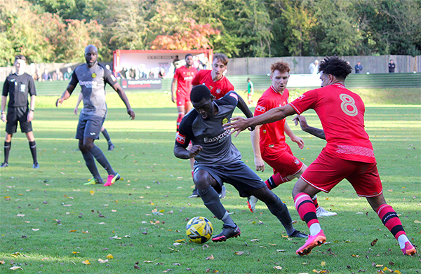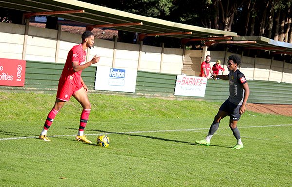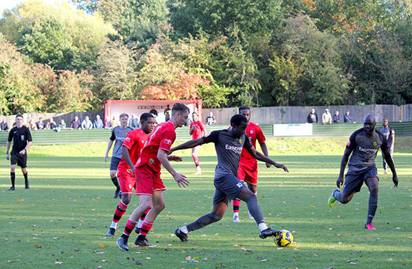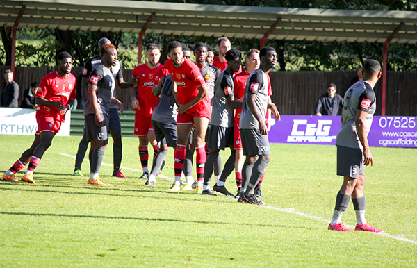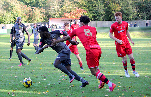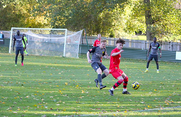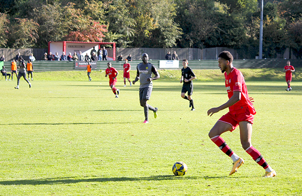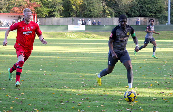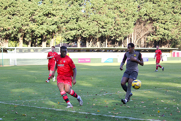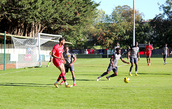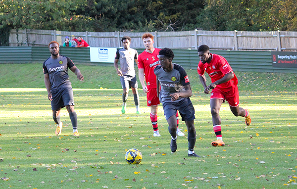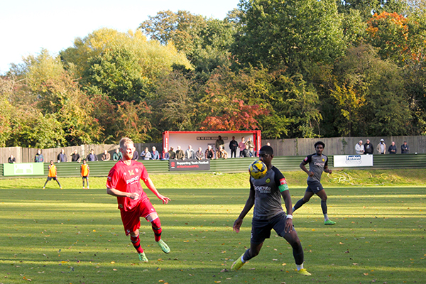 The goal had injected energy into the game and chances started to come thick and fast. Aziz Sankho skied one over Andrew McCorkell’s net, with Ibie and Jackson each emulating him on the other side of the pitch a few minutes later. In-between the two misses, Merstham had their first shot on target; Jordan Wilson saw his poke towards goal matched by the goalkeeper after he played a quick one-two down the channel.
