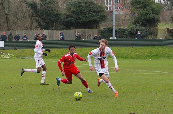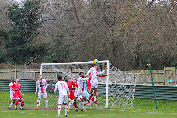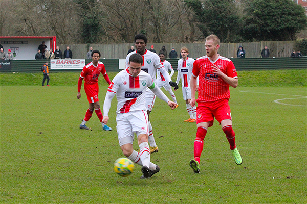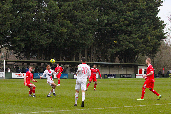 The Tanners, who could boast the division’s best defensive record, were able to welcome back regular central defender Ollie Cook to strengthen their starting line-up having notched an impressive 4-1 win over Raynes Park Vale in midweek.