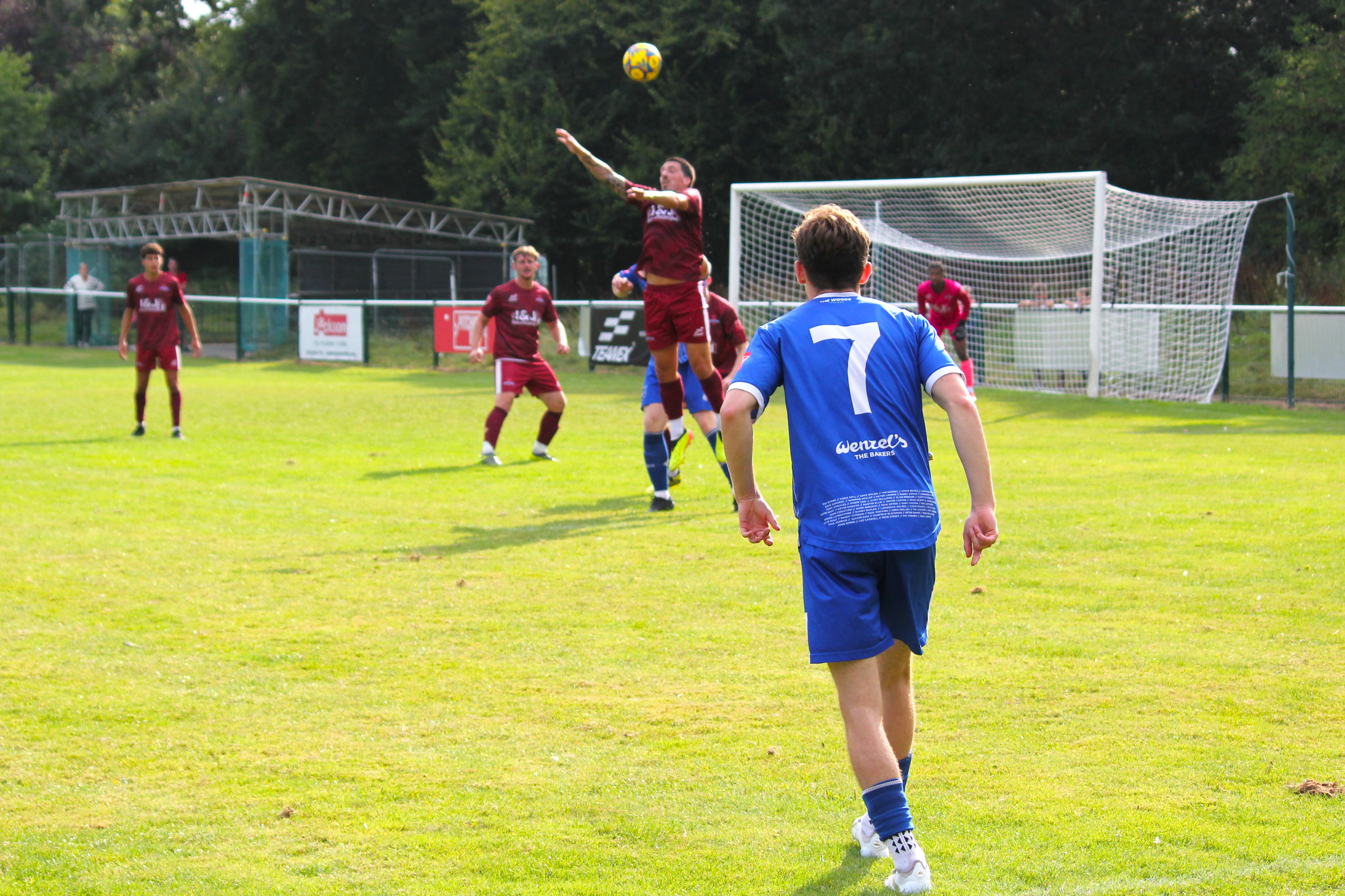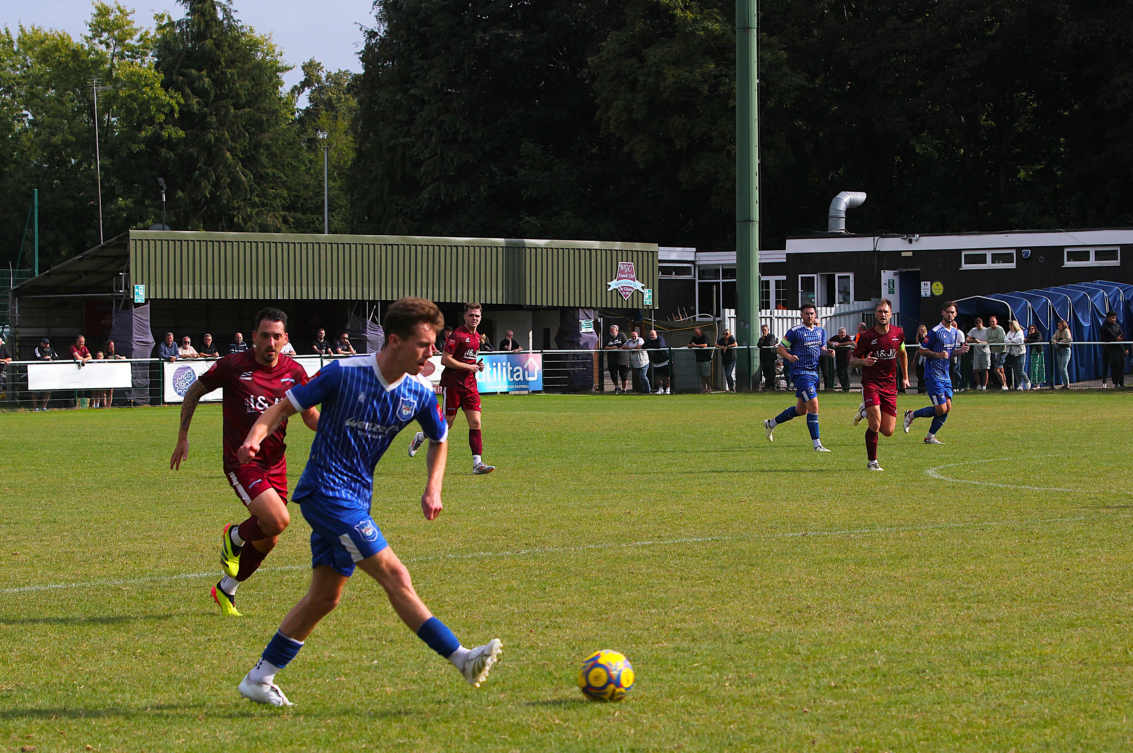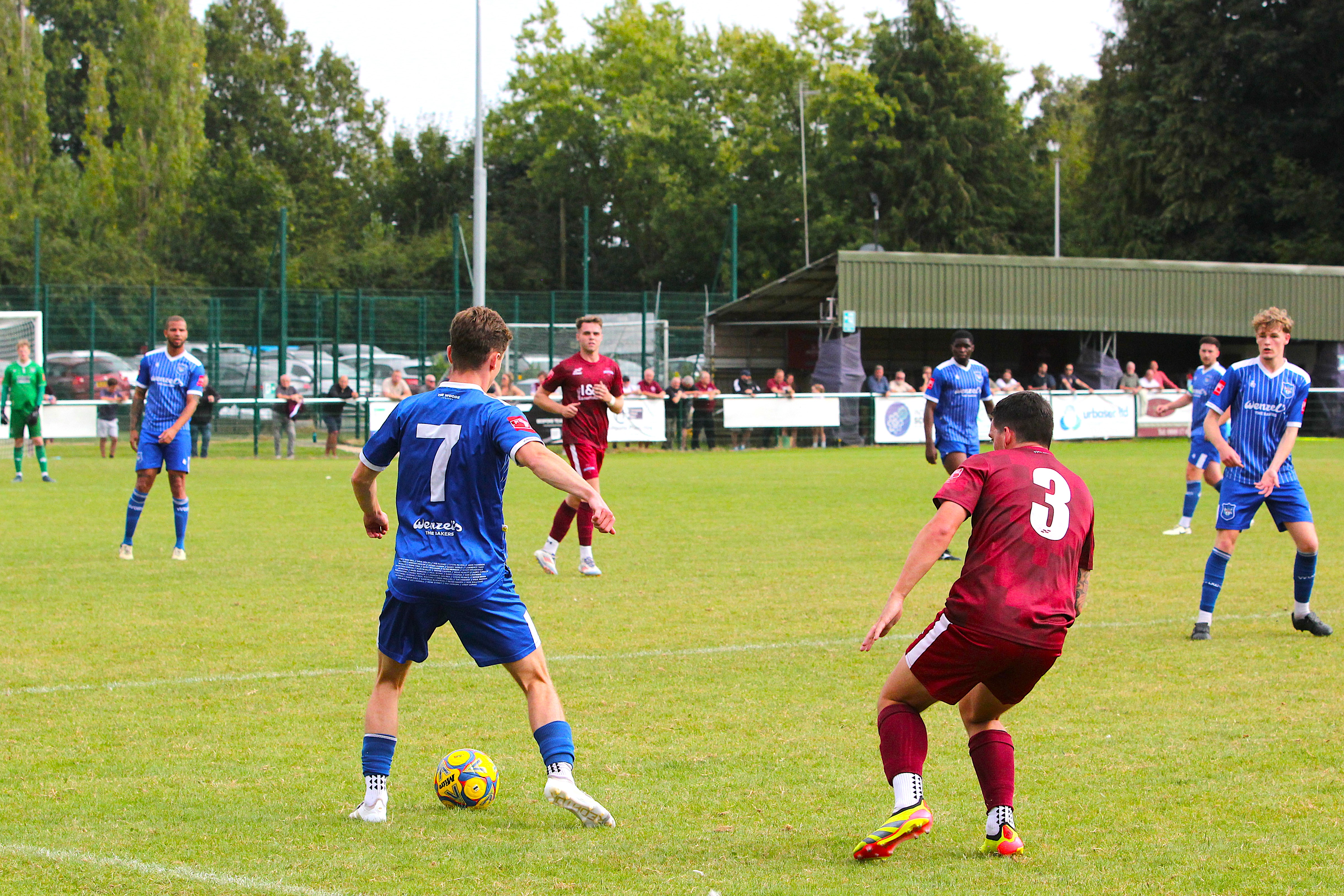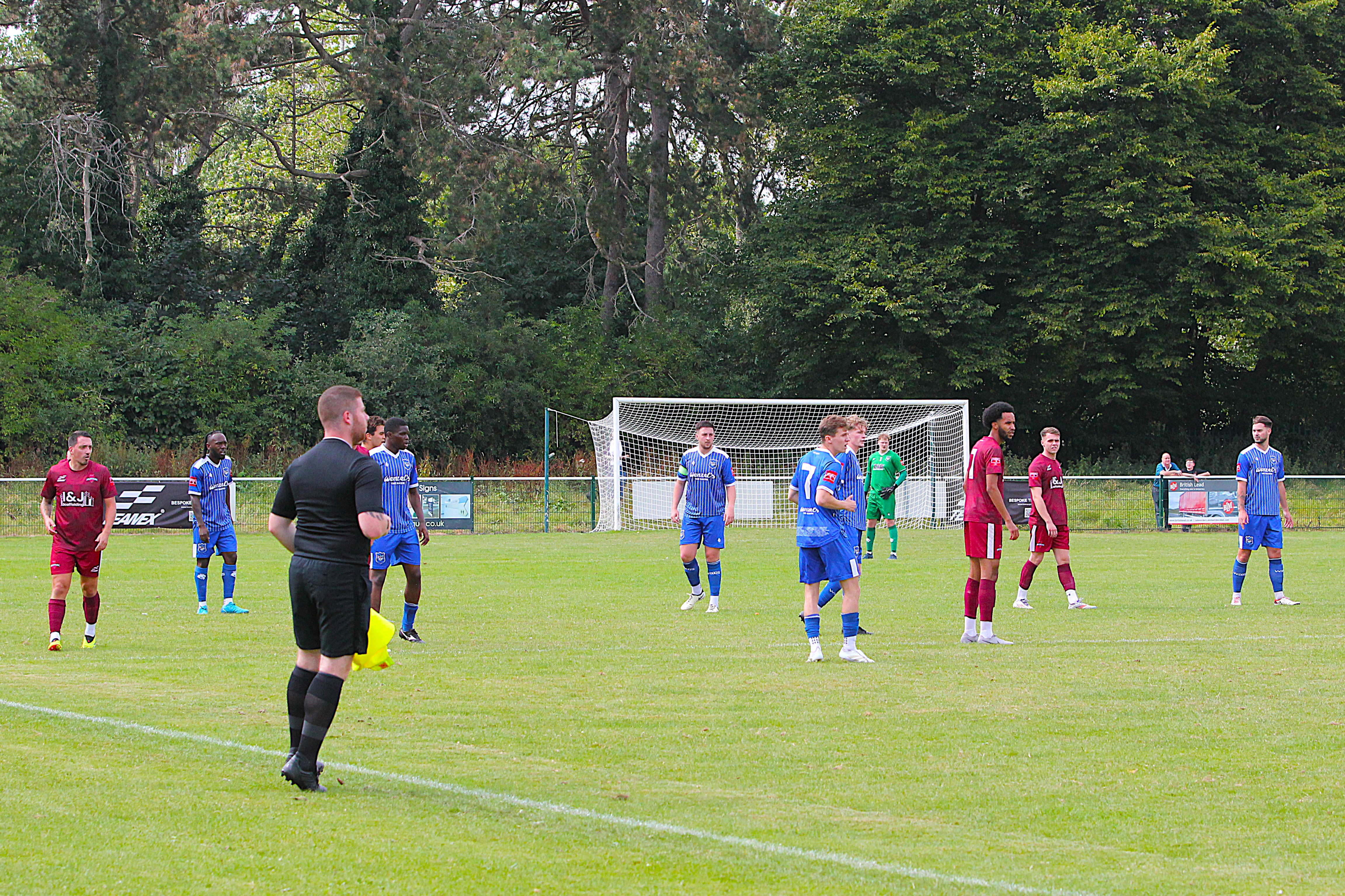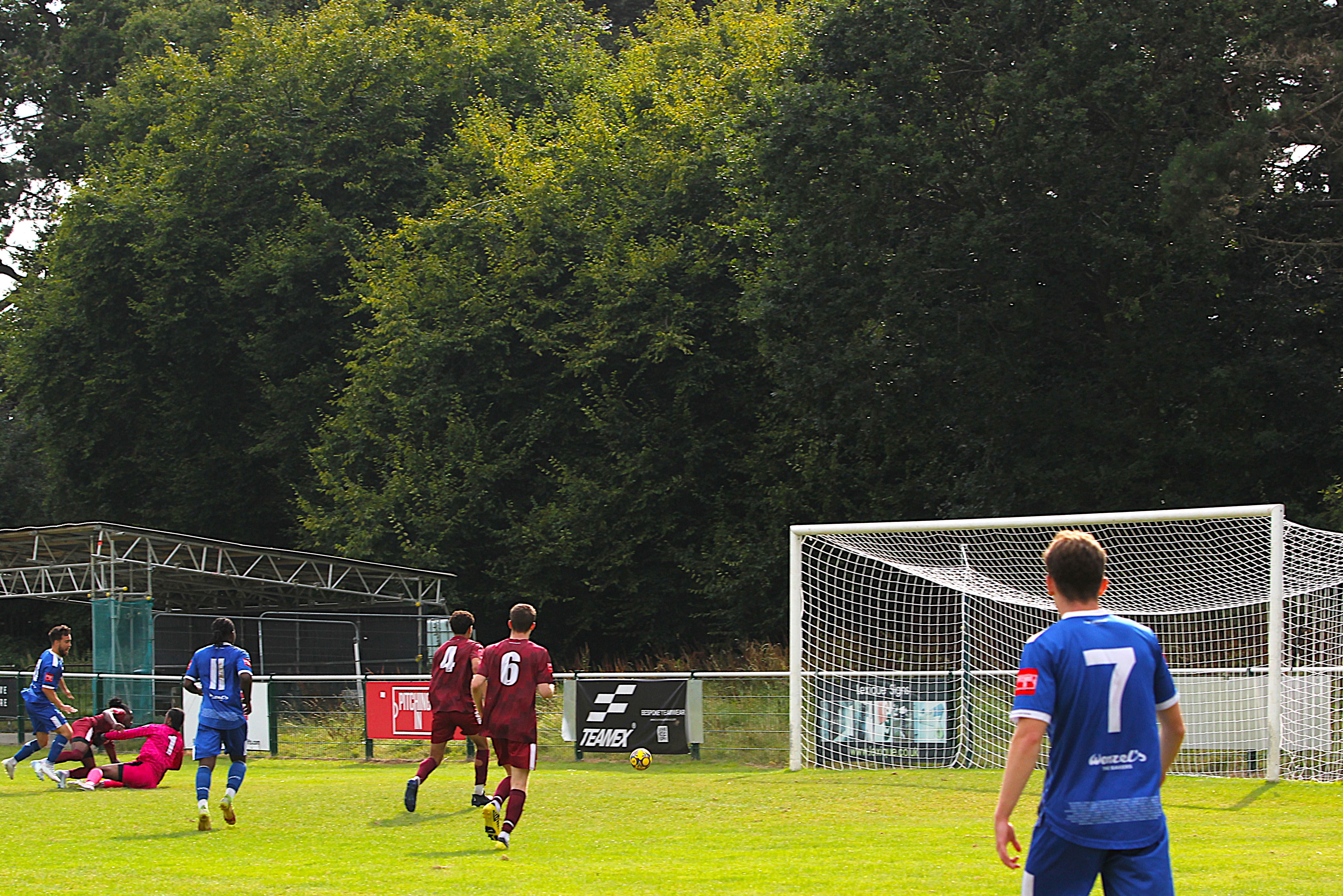 The sun was shining for Northwood’s first-ever visit to Herns Way and there was a slow start to the game with a run and cross from David Agyemang that clipped the crossbar the only action early on. But after eight minutes, the in-form Bailey Stevenson claimed the first shot on goal as his effort from wide on the right was comfortably saved by Dan Hosier at the near-post.