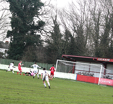 The hosts were looking increasingly dangerous as they delivered a strong finish to the opening period with the lively Woods being denied by a last-ditch Lewis Ochoa tackle before the Sarnies’ striker was almost in on goal again but was crowded out by the Northwood defence. At the other end, McDonnell did well to find Martin in a dangerous position but Lewis Cole was on hand to divert the danger for Egham.
