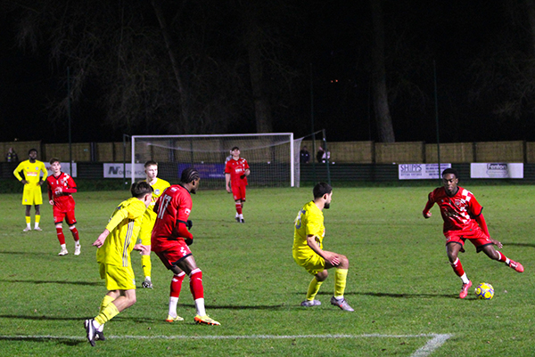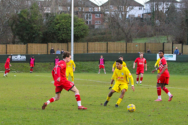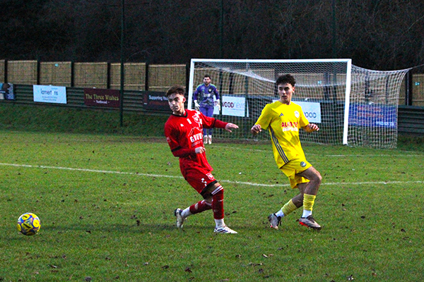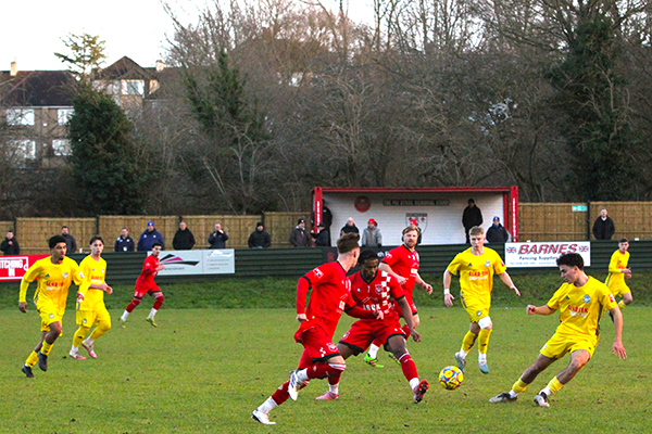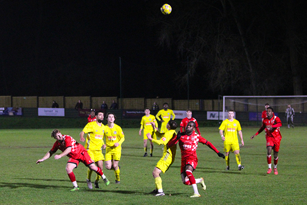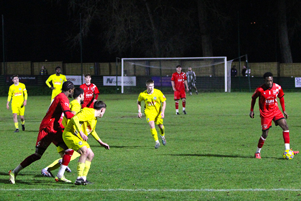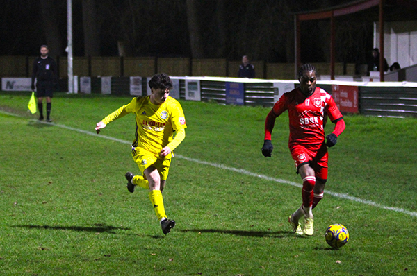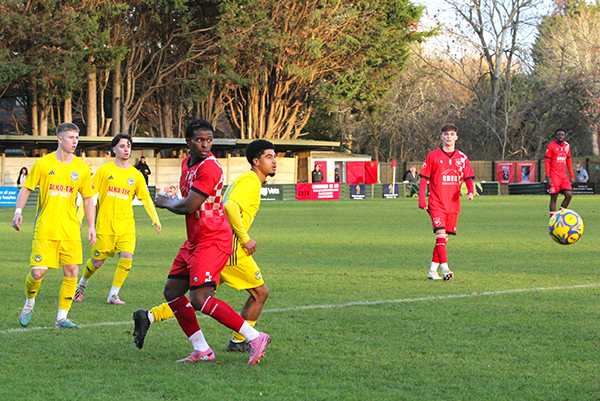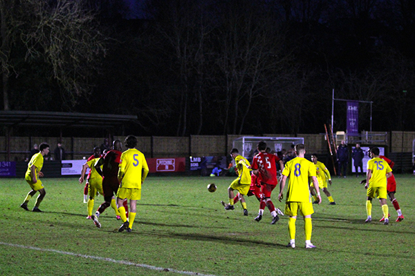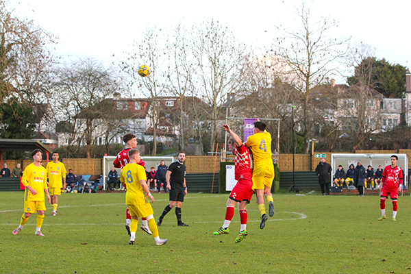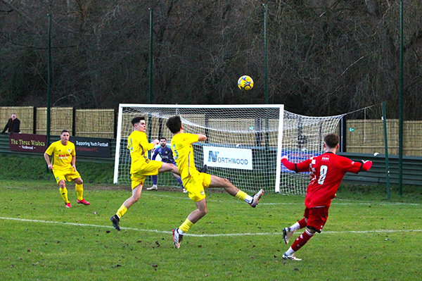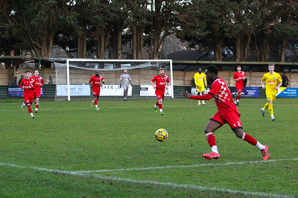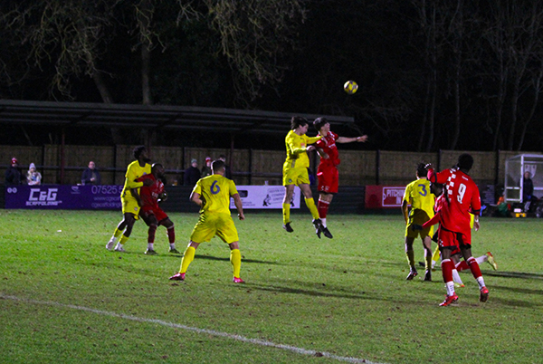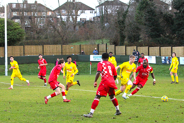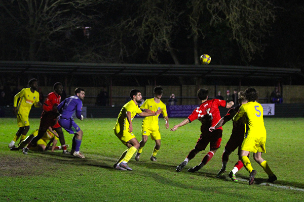 Hertford were knocking the ball around comfortably too and Gabe Cuthbert did well to head away a dangerous cross to concede a corner. Soon after, a deep cross was well controlled by Joe Nardelli and he got a sight on goal but crashed his powerful shot well over the bar.