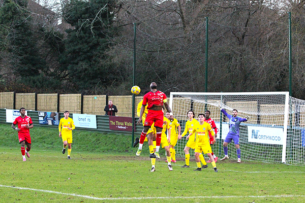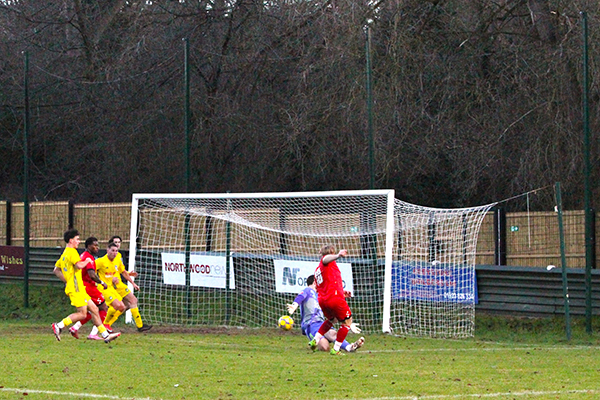 The lead didn’t last long though; just six minutes. A free-kick was harshly given against Northwood wide on the left and, straight from the training-ground, player-manager Ben Herd got an early run on his marker to meet the well-delivered ball and coolly flicked it home from close-range.
