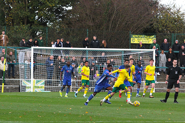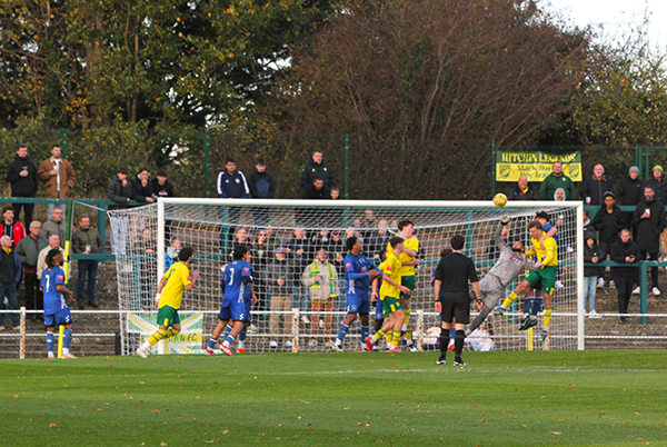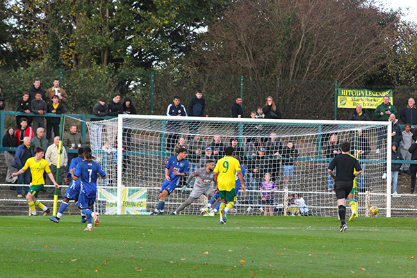 Six minutes later, Callum Kane got forward down the left and whipped in a good cross but it was knocked wide at the far post and as Hitchin continued to dominate possession, a chip forward from Callum Nicholson almost picked out the diving header of Taylor Rhiney but he couldn’t quite make contact.