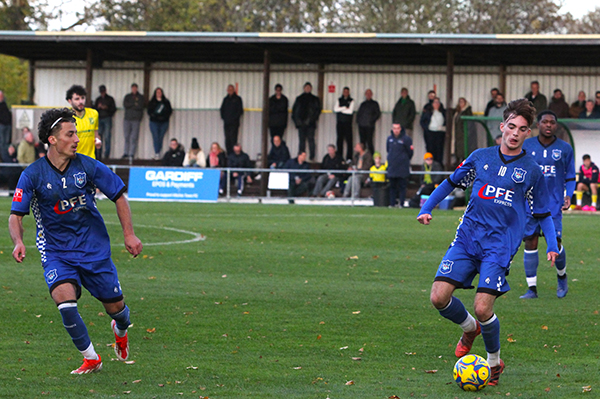 With a big crowd and a strong breeze behind them, the home side started on the front foot and there was just six minutes on the clock when they forced a corner and from a good delivery by Josh Caldicott-Stevens, skipper Ciaren Jones steered a header over the bar.