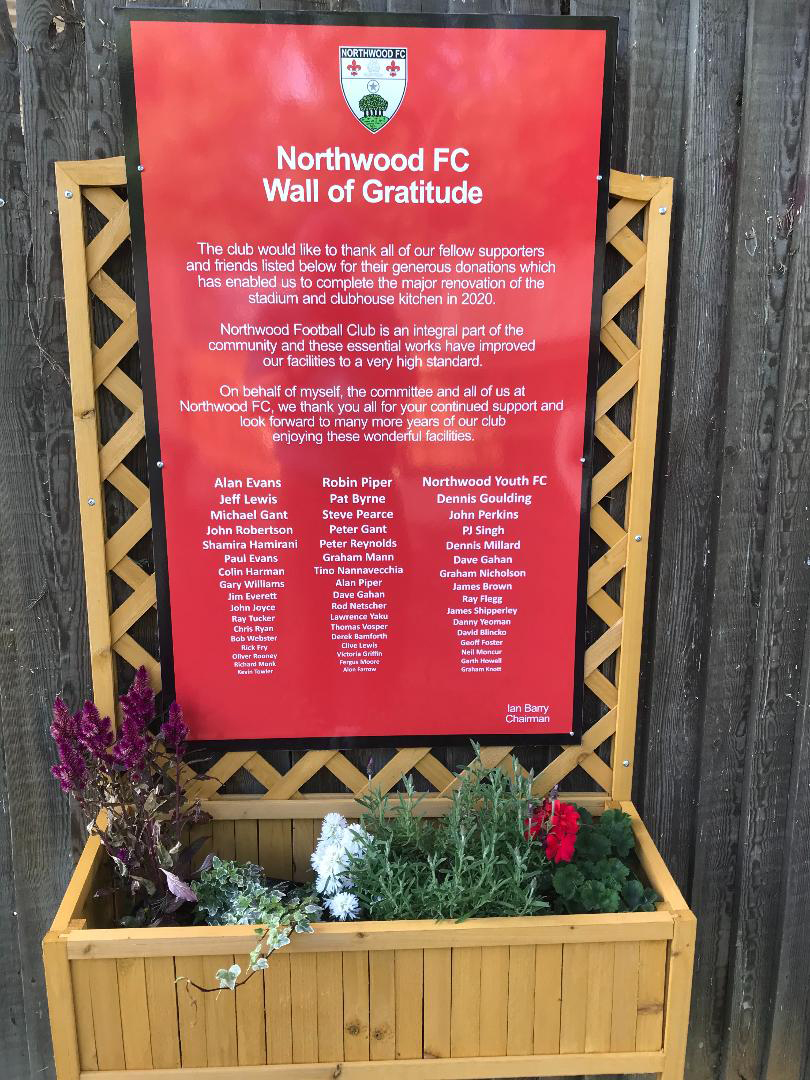 The ground work was made possible thanks to a grant awarded to the club by the Football Stadium Improvement Fund and topped up by donations from a select band of Northwood supporters, whose generosity has been commemorated on a "Wall of Gratitude" that has been erected just inside the Club's new turnstile block which is now located closer to the clubhouse. The work follows the extensive clubhouse refurbishment that was completed a couple of years ago and even that has now been improved by the completion of a new improved kitchen area which was also funded by the FSIF grant and donations.