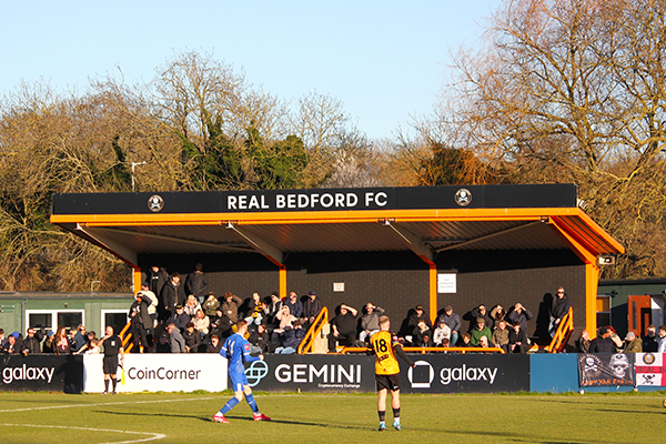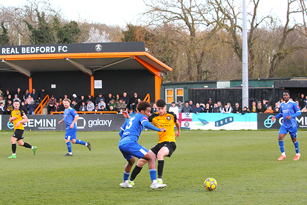 Leaders Real Bedford maintained their title-battle with Berkhamsted, who were playing just a few yards away against Biggleswade on Bedford Town’s ground, with this clinical demolition of the Woods in the first half at the Ledger Stadium.