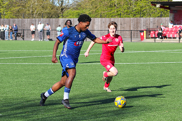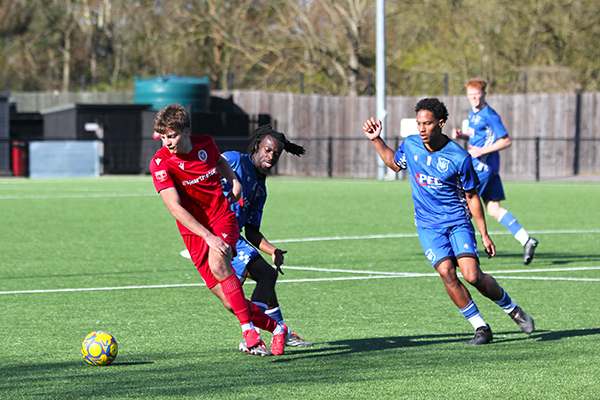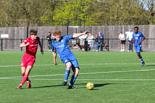 Dani Cruz returned in goal, Tommy Coooney his first start and there was a first-ever start for Woods Under 18 captain Aidan Tarrant in the centre of defence. The Woods made a brilliant start to this game, twice taking full advantage of some defensive mishaps. After just ten minutes, Luke Neville’s header back to the hesitant goalkeeper Tommy Dymott was short and Alie Bangura used his pace well to nip in and lob the ball into the empty net.