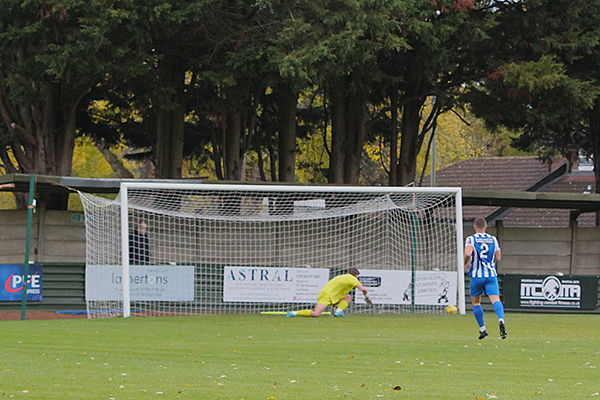 The Woods then almost doubled their lead after 22 minutes when awarded a free-kick centrally about 25 yards out. McKenna was the new designated taker in Miskin’s absence and his curling effort saw Nightingale dive to his right to just tip the ball onto the inside of the post. The ball spun back across the face of the goal and inches wide of the other post before going off for a corner.
