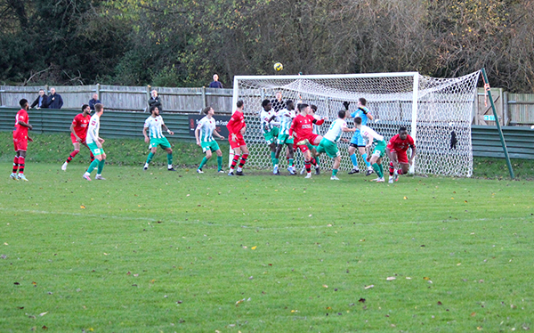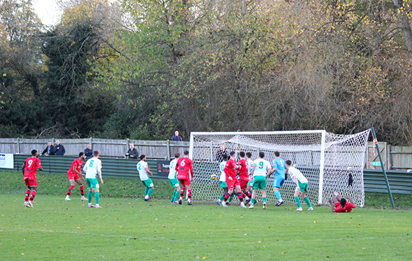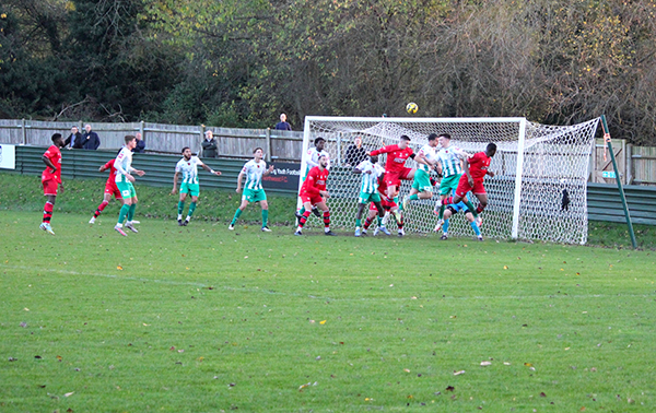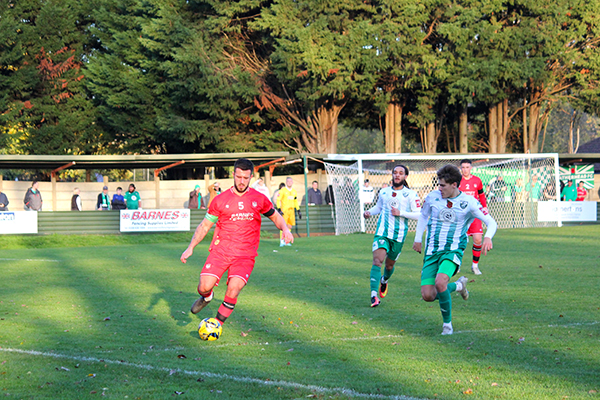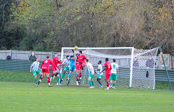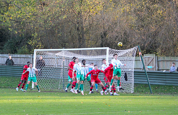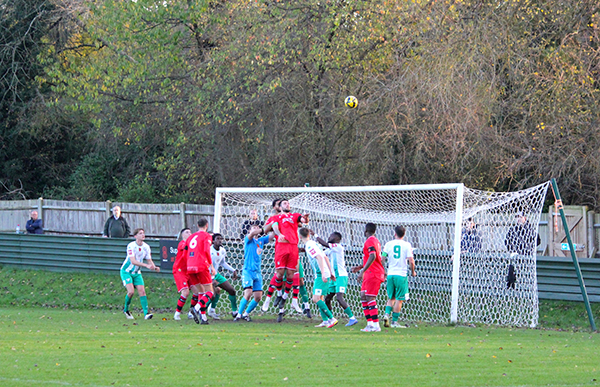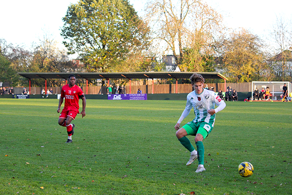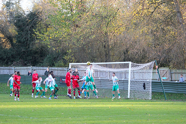Woods maintained their positive start with a Luke Tingey throw being diverted behind before a good link up between Carl Stewart, Hutchins and Sydney Ibie saw the latter’s low cross being diverted for a corner. And the hosts early dominance continued as they forced another corner which saw Gallagher’s close-range header blocked by the Leatherhead rearguard.