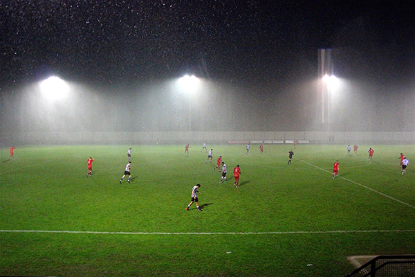 As conditions worsened with wind, rain and hail sheeting across the ground, the referee called a temporary halt to proceedings to allow the squall to pass through. After a three-minute break, play resumed on an increasingly difficult surface.