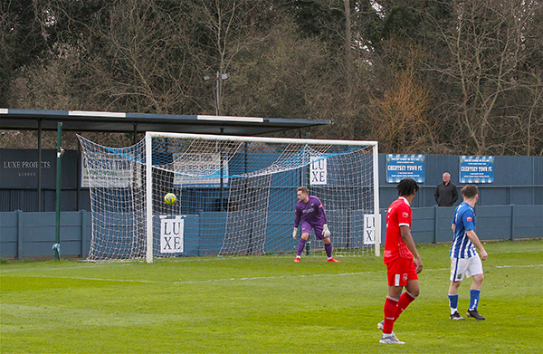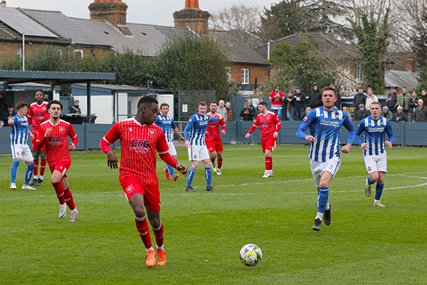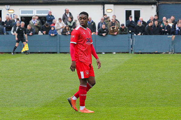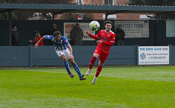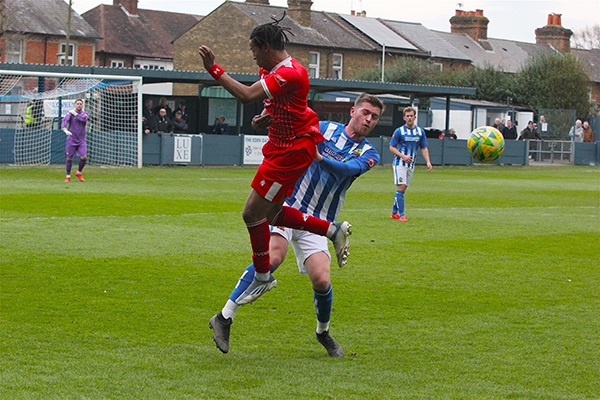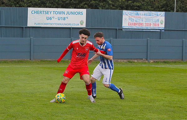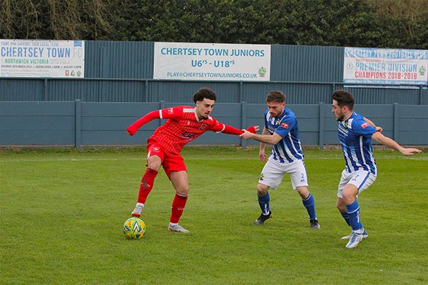 On seven minutes, the same players combined again and this time Dunbar-Bonnie’s cross almost picked out Lucas Sinclair in the centre but the ball was just taken off his toe by a defender. Three minutes later, a Luke Tingey throw was touched on Sinclair and fell into a dangerous area of the six-yard box but again it was cleared. Almost immediately, Laaref danced through the Chertsey defence down the right but his cross failed to pick out any of his fellow attackers.