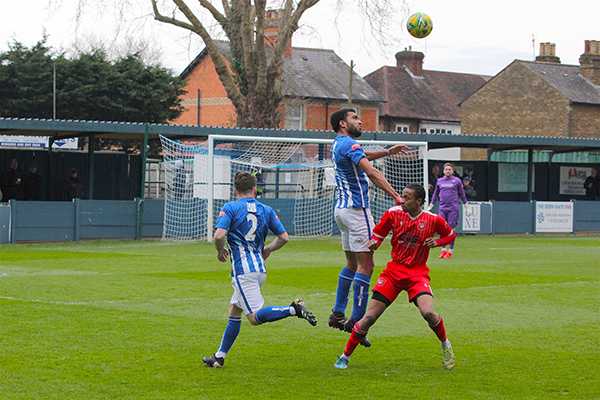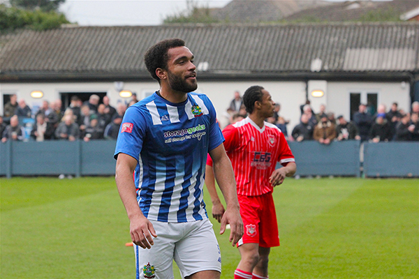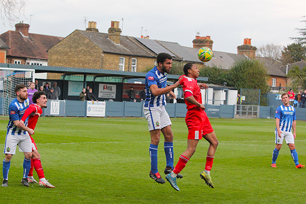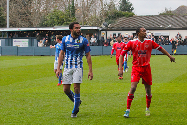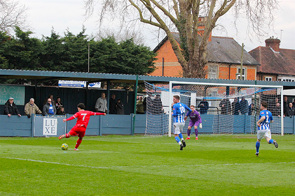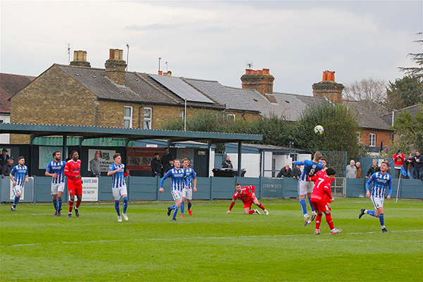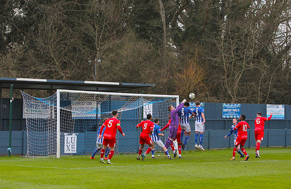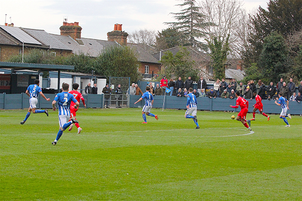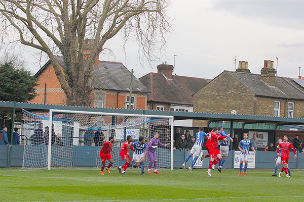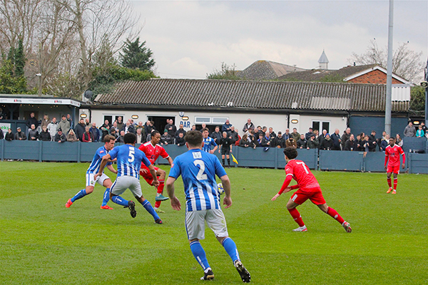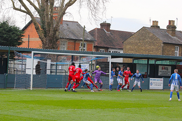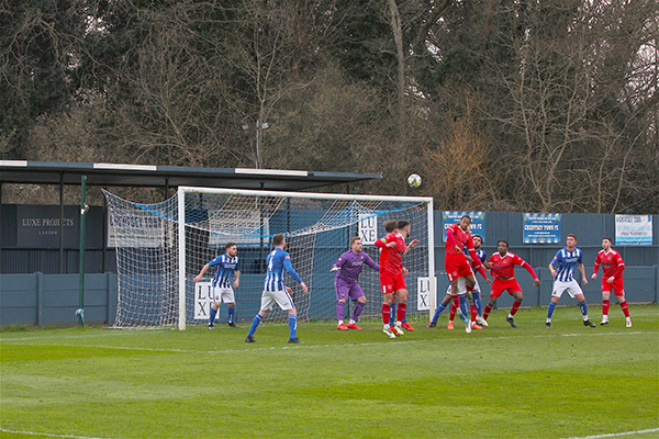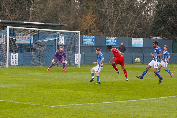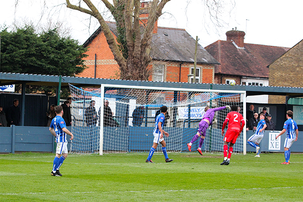 The home side had hardly had a look-in until the 16th minute when a wayward pass in midfield saw Reece Robins play a quick ball wide to Louis Degand whose cross from the left was aimed for top scorer Gianluca Botti but Andrew McCorkell managed to push it wide before it reached the waiting striker.