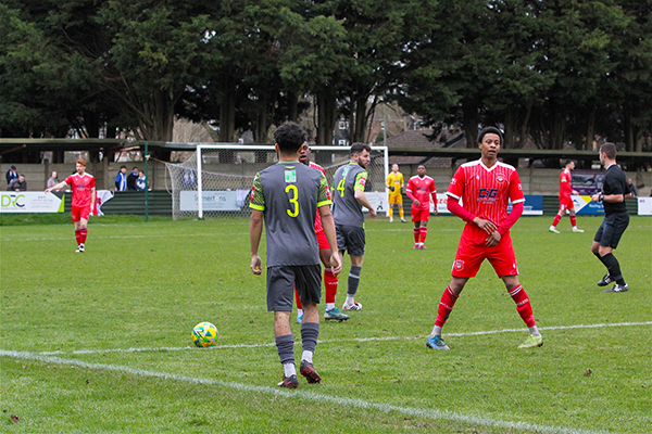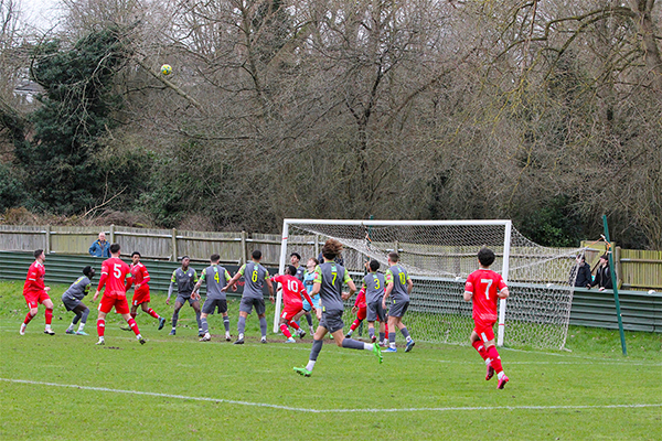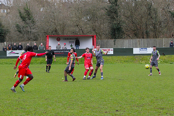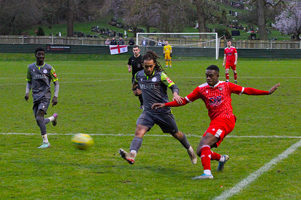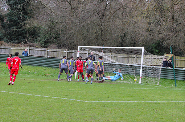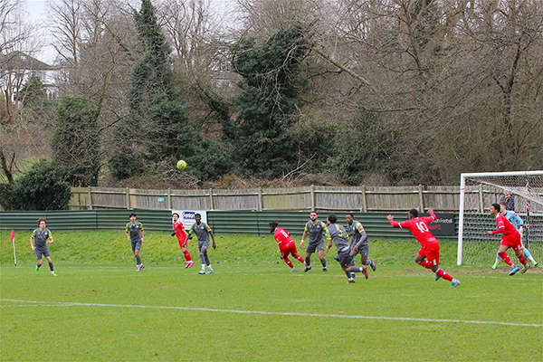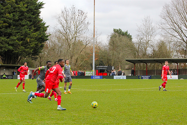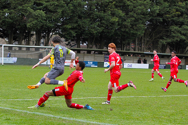 After 29 minutes another throw-in from Tingey caused problems and Sam Jenkins touched it into the net but unfortunately it was clearly with his hand and his was booked for his misdemeanour. Two minutes later, Anokye-Boadi again proved a thorn in the visitors’ side as a chance opened up for him but his strike flashed across the goal and wide.