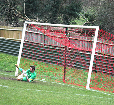 The Woods tried hard to respond against the conditions and when a corner was only half-cleared Andy Lomas went for goal but the ball was always rising and flew over the bar. There was a clash of head on 15 minutes which left both Bradshaw and Louis Stead needing treatment for cuts and the Woods continued to look to make some headway, forcing another corner on 23 minutes. This time, Steve Brown went up for a header only to be clattered by goalkeeper Mayson Tewkesbury who conceded both a penalty and a yellow card. It was a great opportunity to get back on level terms but in-form striker Niko Muir’s spot-kick lacked power and Tewkesbury redeemed himself, saving low to his left.