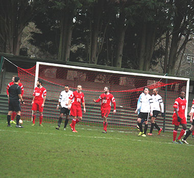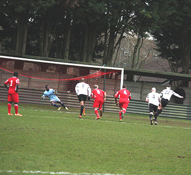 It was a disastrous minute for Northwood. The keeper moved the ball swiftly upfield and the tricky Rhys Hoenes moved in from the left to knock in a good cross which was glanced home by Simon Thomas to double the Crows lead. Before the Woods had much time to regroup, Hoenes, who had won two penalties for his side in a midweek win at Ware, went down in the box under a challenge by Stead and the Referee pointed to the spot once again. Bradshaw showed no ill effects from his head injury by smacking the ball into the roof of the net from twelve yards and at 0-3, Royston were suddenly in complete command.
